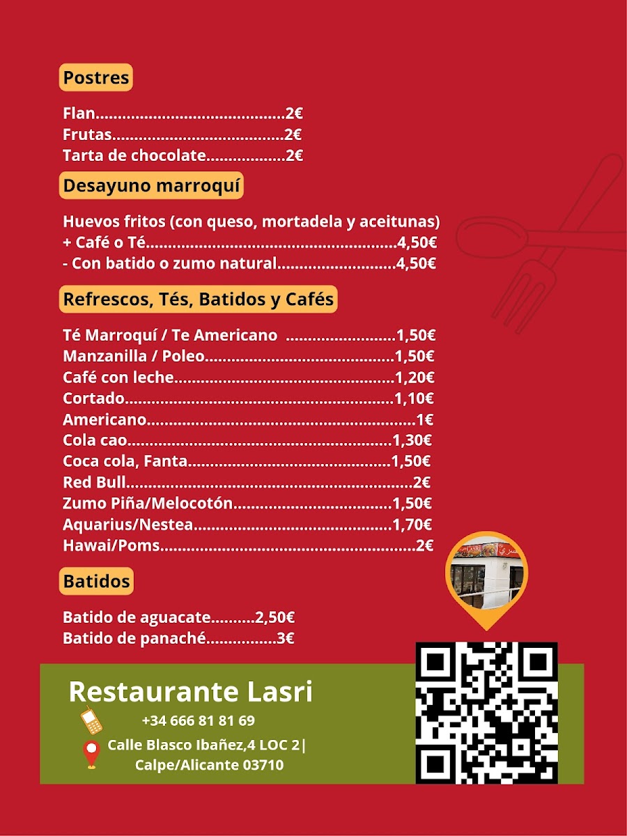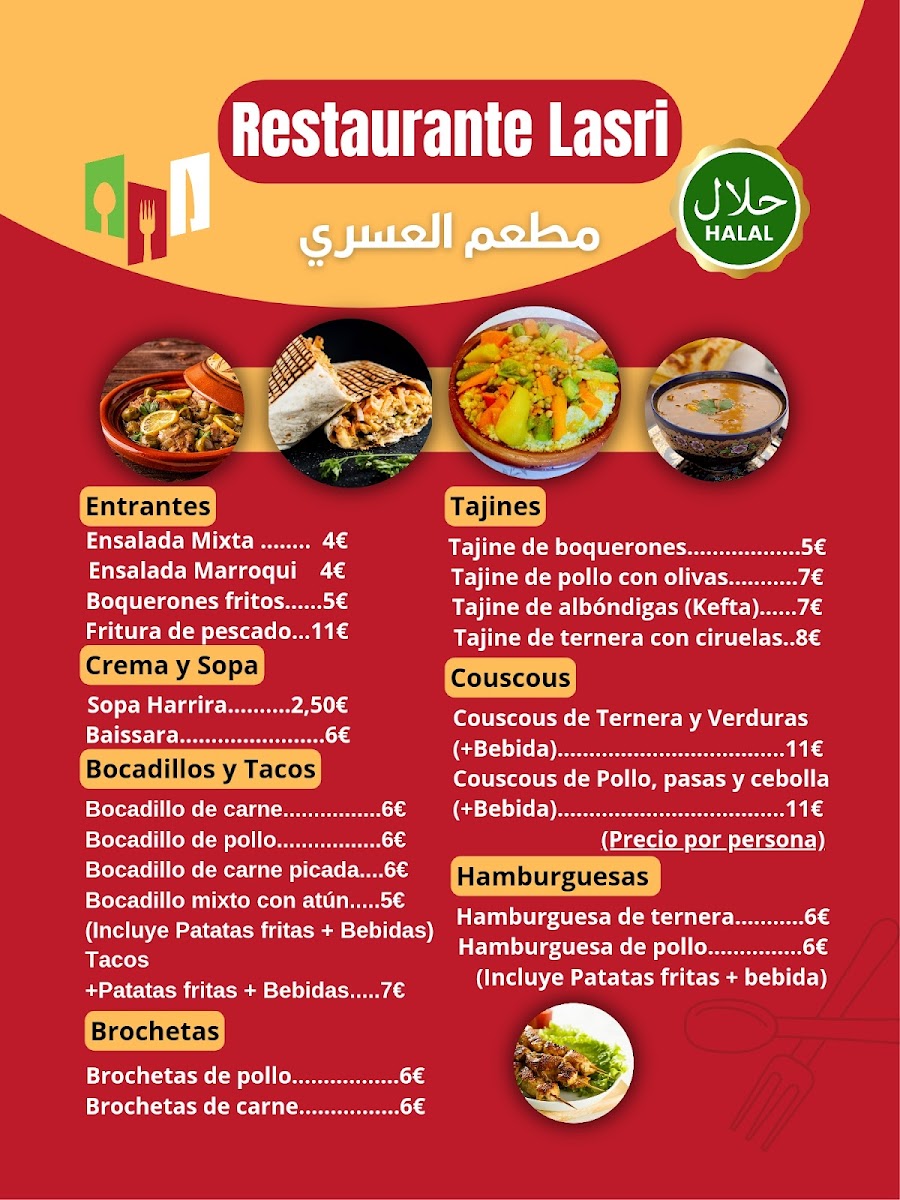 Restaurante Lasri Halal offers a straightforward menu that blends Moroccan comfort food with familiar casual bites, perfect for a quick lunch, a relaxed dinner, or a light snack throughout the day. The selection reflects a balance between traditional dishes and simple fast-food style options, creating a welcoming atmosphere where both locals and visitors can enjoy a flavorful meal without fuss.